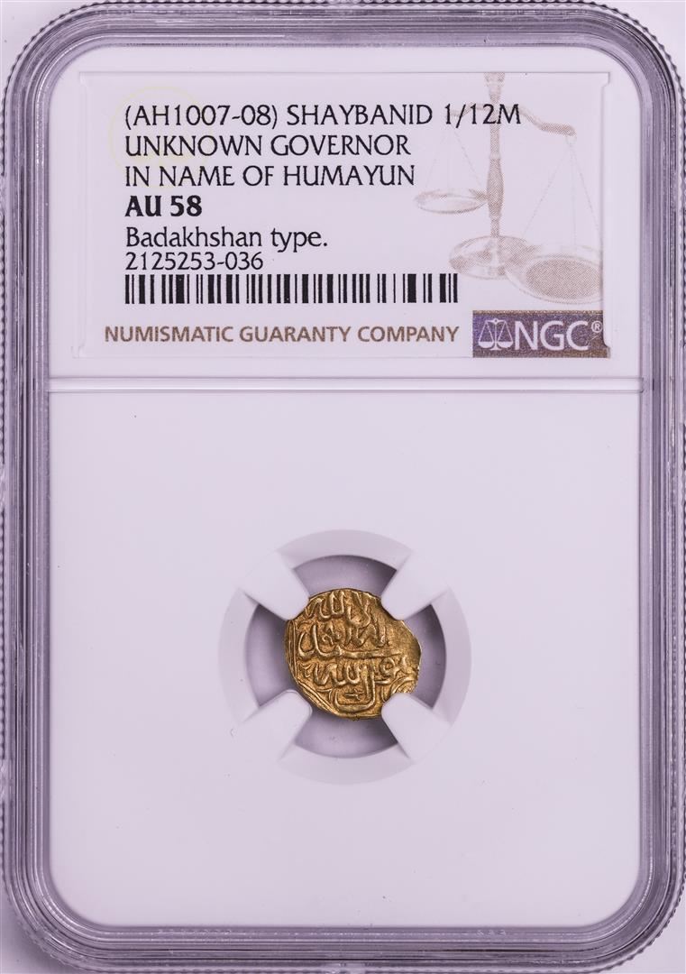 AH1007-08 Shaybanid 1/12 Mohur Gov. in Name of Humayun Badakhshan Gold Coin NGC AU58