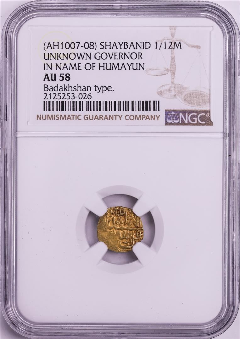 One AH1007-08 Shaybanid 1/12 Mohur Gov. in Name of Humayun Badakhshan Gold Coin NGC AU58. NGC Certified.