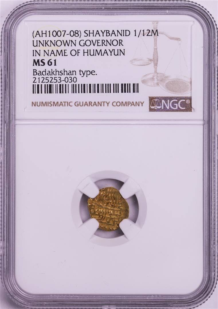 One AH1007-08 Shaybanid 1/12 Mohur Gov. in Name of Humayun Badakhshan Gold Coin NGC MS61. NGC Certified.