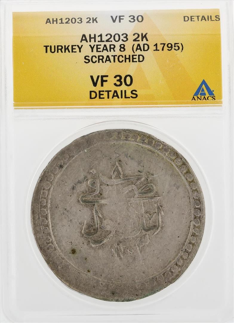 One AH1203 2 Kurush Turkey Year 8 AD 1795 Scratched Coin ANACS VF30 Details. ANACS Certified.