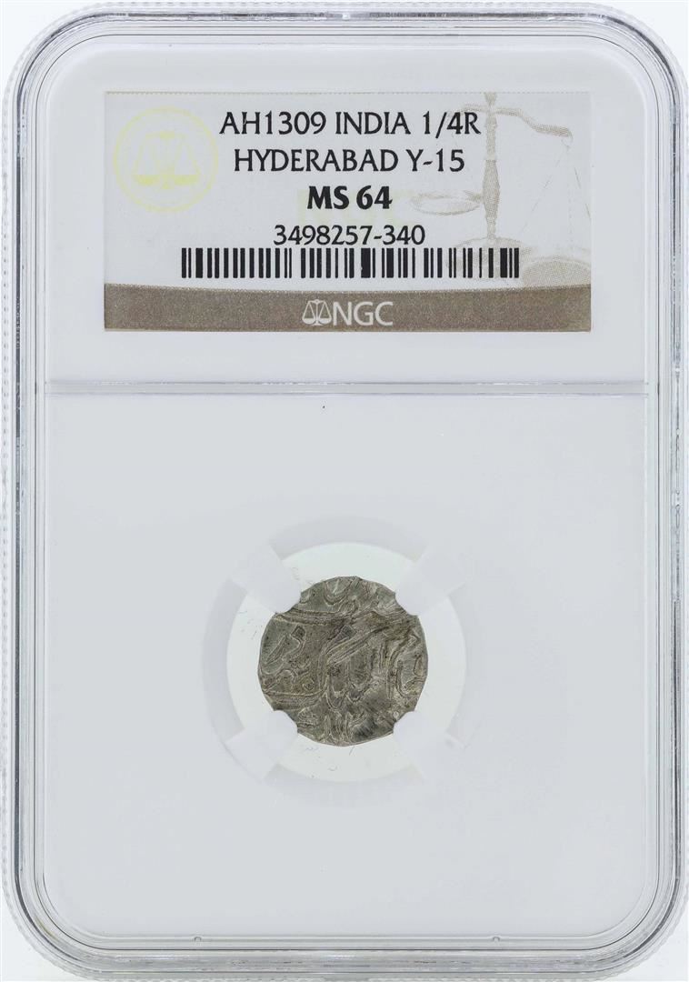 One AH1309 India 1/4 Rupee Hyderabad Y-15 Coin NGC MS64. NGC Certified.
