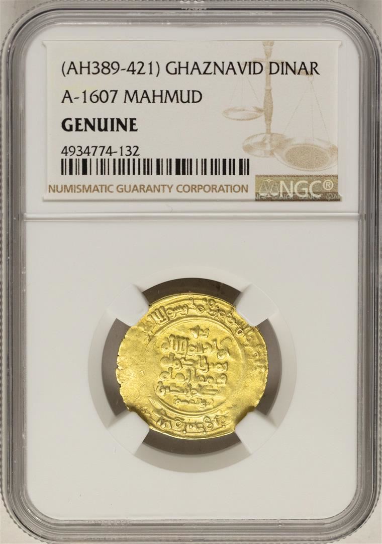 One AH389-421 Ghaznavid Dinar A-1607 Mahmud Gold Coin NGC Genuine. NGC Certified.