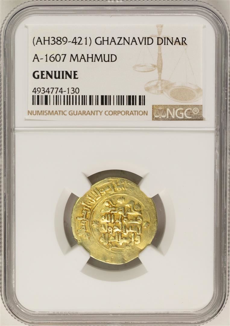 One AH389-421 Ghaznavid Dinar A-1607 Mahmud Gold Coin NGC Genuine. NGC Certified.