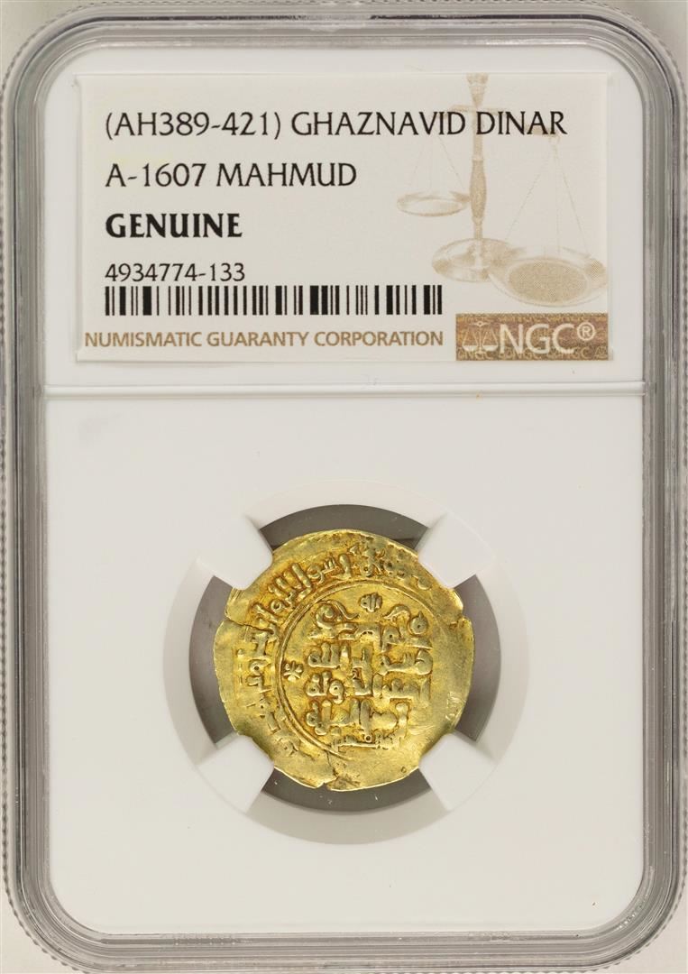 One AH389-421 Ghaznavid Dinar A-1607 Mahmud Gold Coin NGC Genuine. NGC Certified.