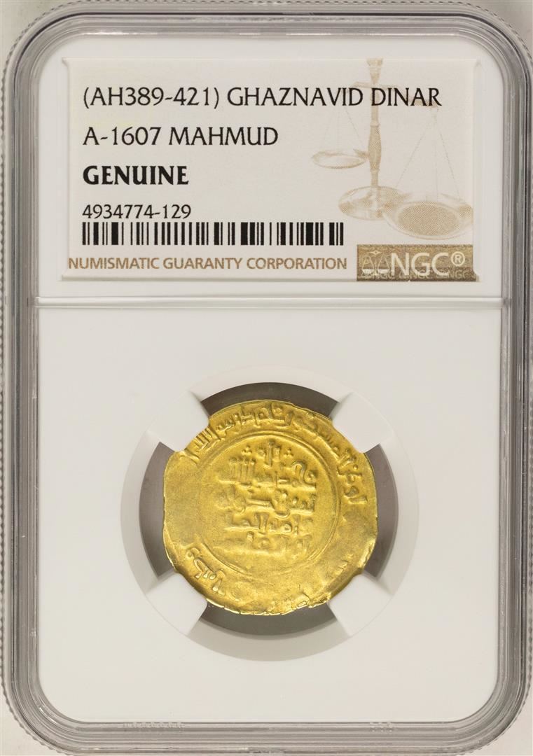 One AH389-421 Ghaznavid Dinar A-1607 Mahmud Gold Coin NGC Genuine. NGC Certified.