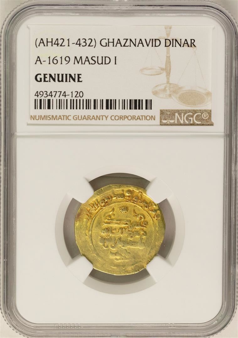 One AH421-432 Ghaznavid Dinar A-1619 Masud I Gold Coin NGC Genuine. NGC Certified.