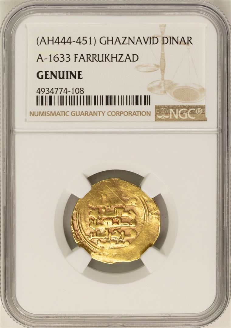 One AH444-451 Ghaznavid Dinar A-1633 Farrukhzad Gold Coin NGC Genuine. NGC Certified.