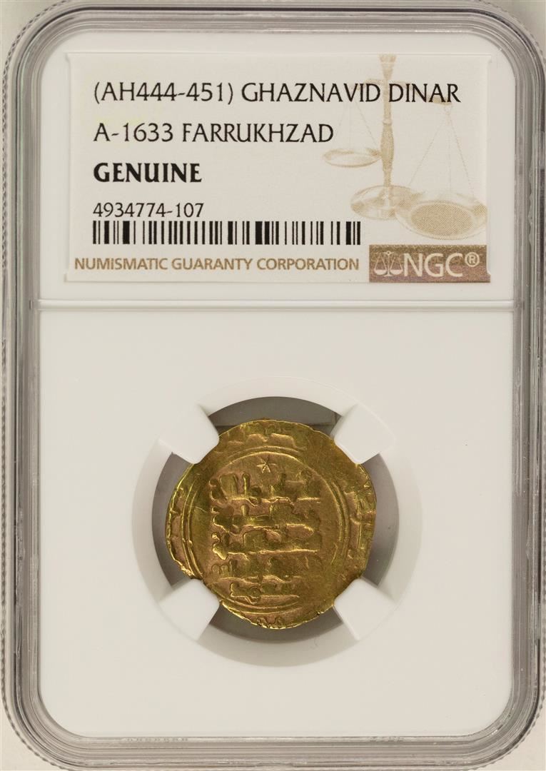One AH444-451 Ghaznavid Dinar A-1633 Farrukhzad Gold Coin NGC Genuine. NGC Certified.