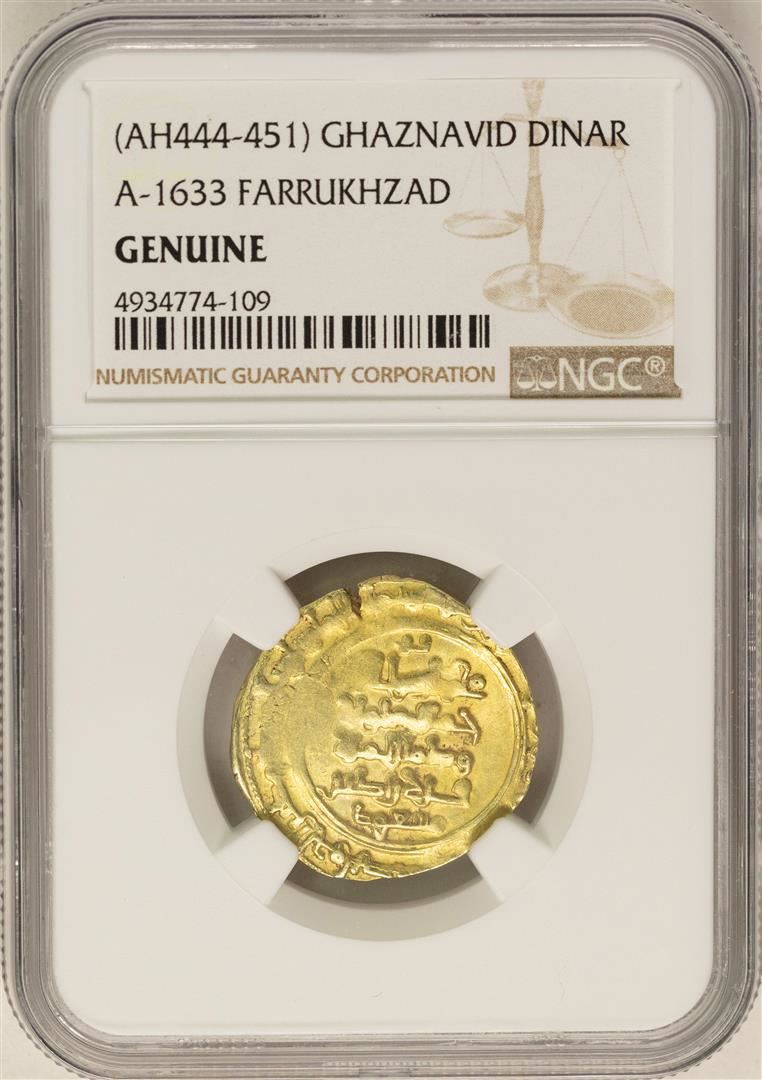 One AH444-451 Ghaznavid Dinar A-1633 Farrukhzad Gold Coin NGC Genuine. NGC Certified.