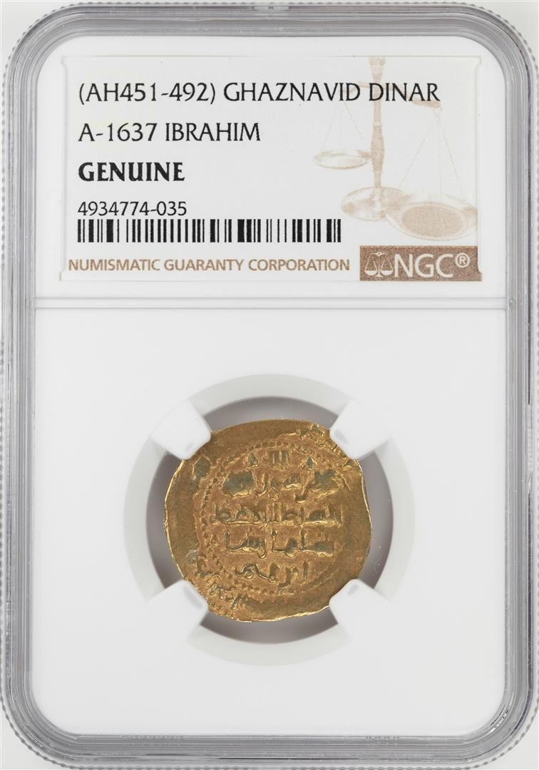 One AH451-492 Ghaznavid Dinar A-1637 Ibrahim Gold Coin NGC Genuine. NGC Certified.