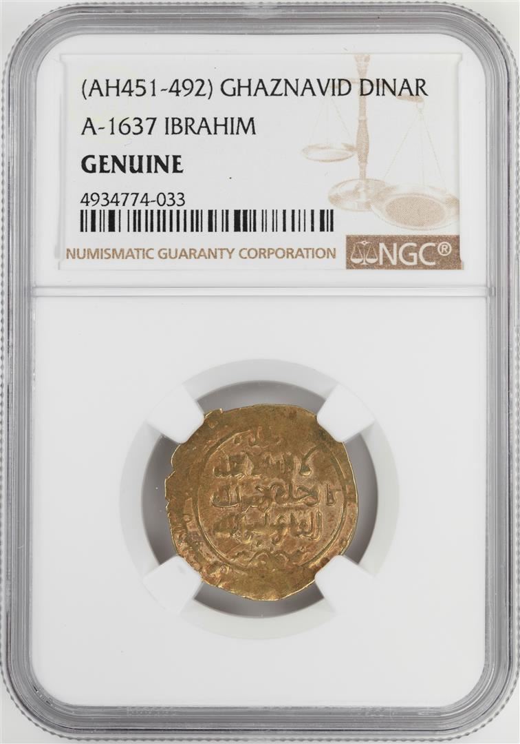 One AH451-492 Ghaznavid Dinar A-1637 Ibrahim Gold Coin NGC Genuine. NGC Certified.