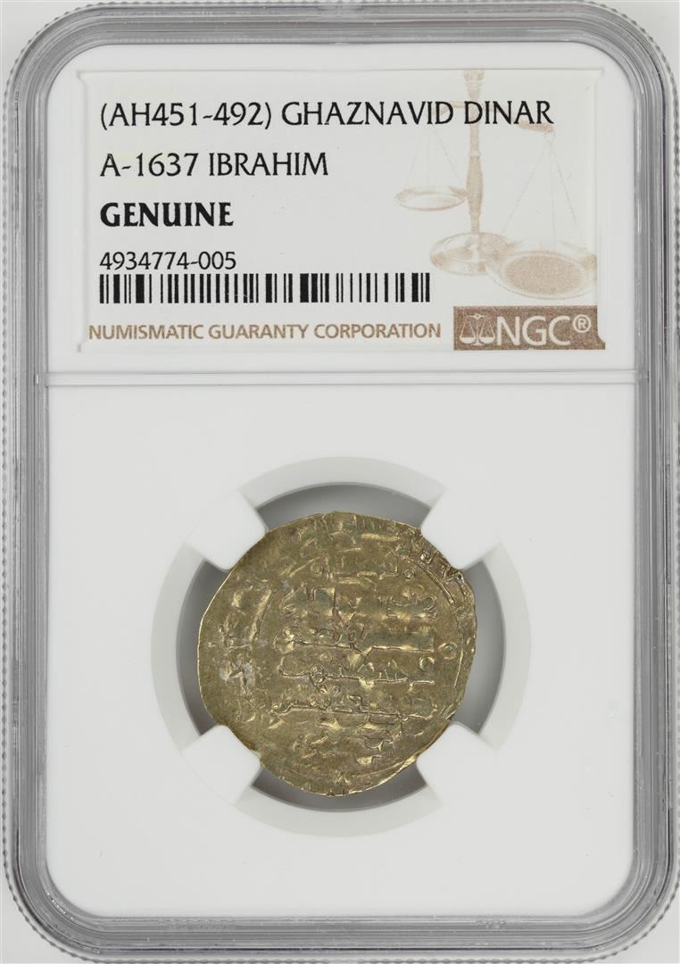 One AH451-492 Ghaznavid Dinar A-1637 Ibrahim Gold Coin NGC Genuine. NGC Certified.