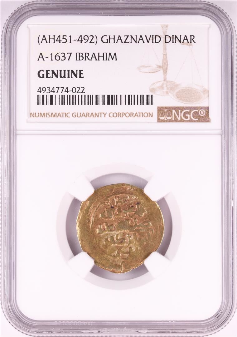 One AH451-492 Ghaznavid Dinar A-1637 Ibrahim Gold Coin NGC Genuine. NGC Certified.