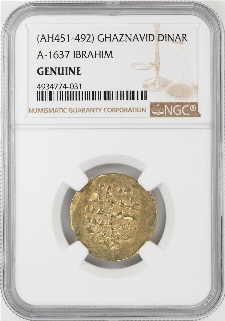 One AH451-492 Ghaznavid Dinar A-1637 Ibrahim Gold Coin NGC Genuine. NGC Certified.