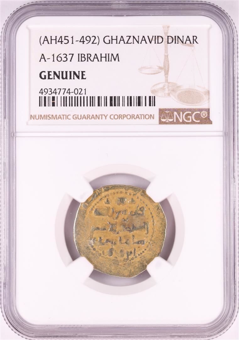 One AH451-492 Ghaznavid Dinar A-1637 Ibrahim Gold Coin NGC Genuine. NGC Certified.