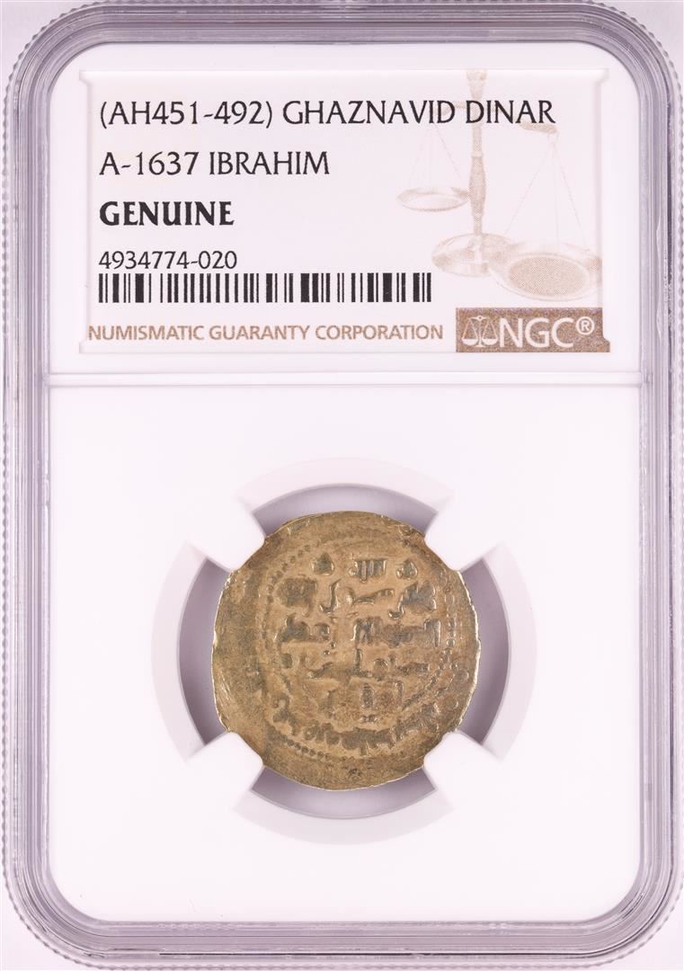 One AH451-492 Ghaznavid Dinar A-1637 Ibrahim Gold Coin NGC Genuine. NGC Certified.