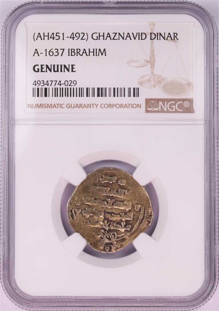 One AH451-492 Ghaznavid Dinar A-1637 Ibrahim Gold Coin NGC Genuine. NGC Certified.