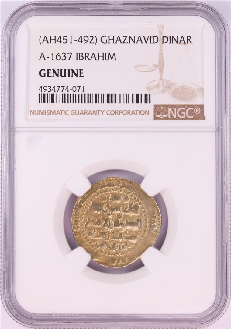 One AH451-492 Ghaznavid Dinar A-1637 Ibrahim Gold Coin NGC Genuine. NGC Certified.