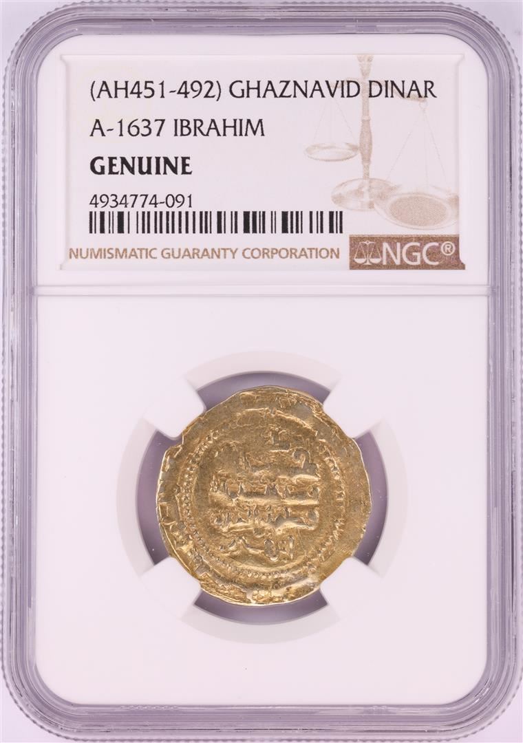 One AH451-492 Ghaznavid Dinar A-1637 Ibrahim Gold Coin NGC Genuine. NGC Certified.