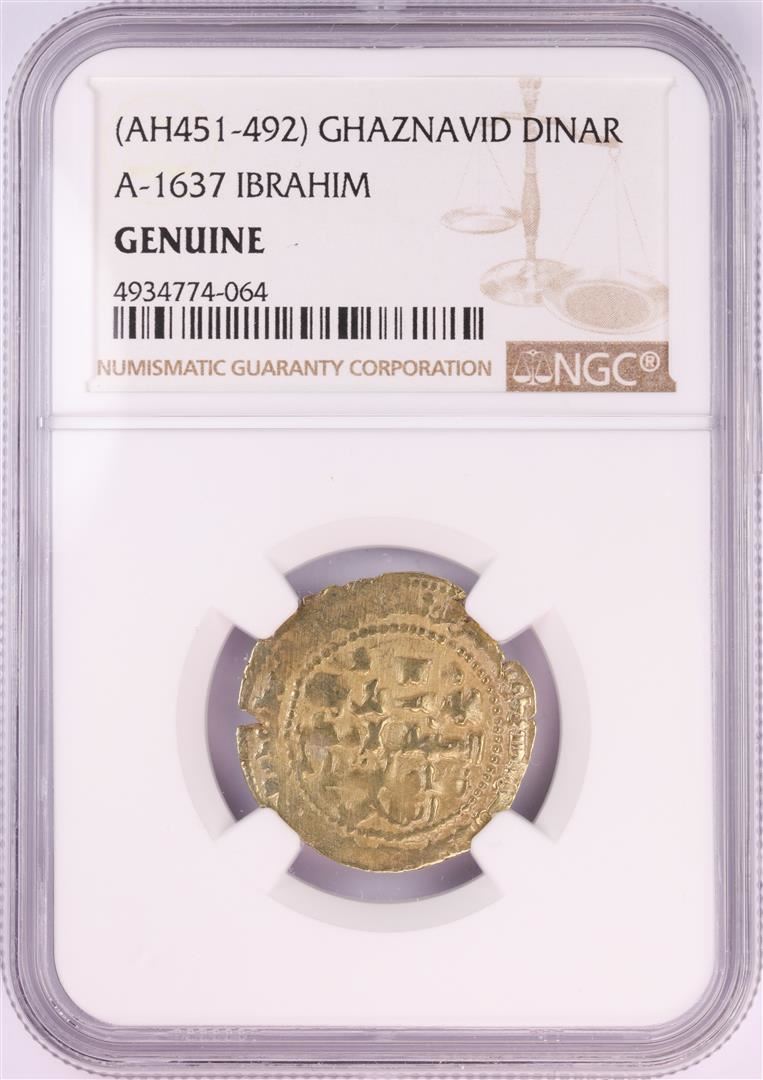 One AH451-492 Ghaznavid Dinar A-1637 Ibrahim Gold Coin NGC Genuine. NGC Certified.