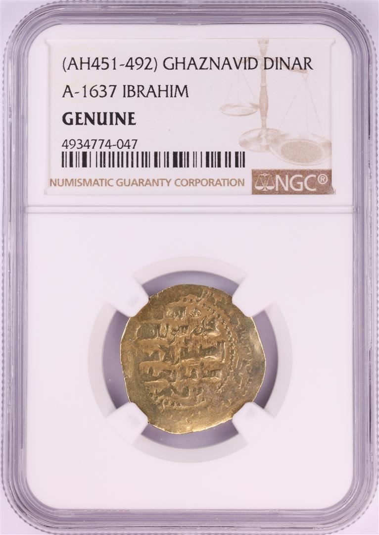 One AH451-492 Ghaznavid Dinar A-1637 Ibrahim Gold Coin NGC Genuine. NGC Certified.