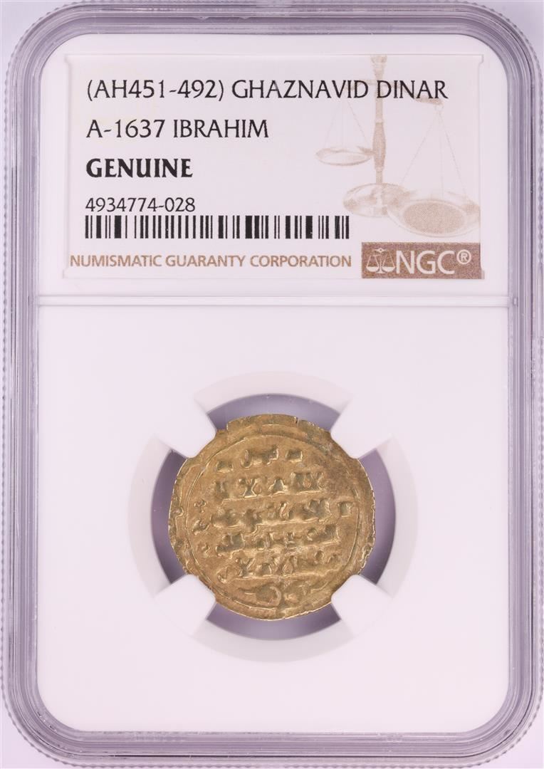 One AH451-492 Ghaznavid Dinar A-1637 Ibrahim Gold Coin NGC Genuine. NGC Certified.