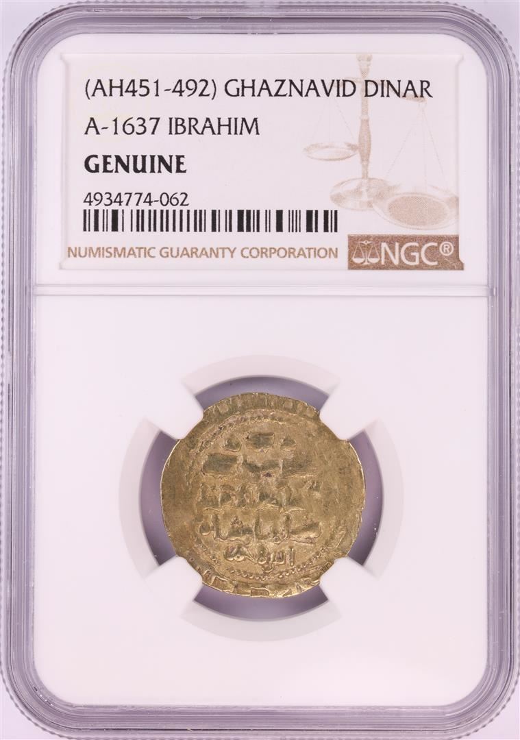 One AH451-492 Ghaznavid Dinar A-1637 Ibrahim Gold Coin NGC Genuine. NGC Certified.
