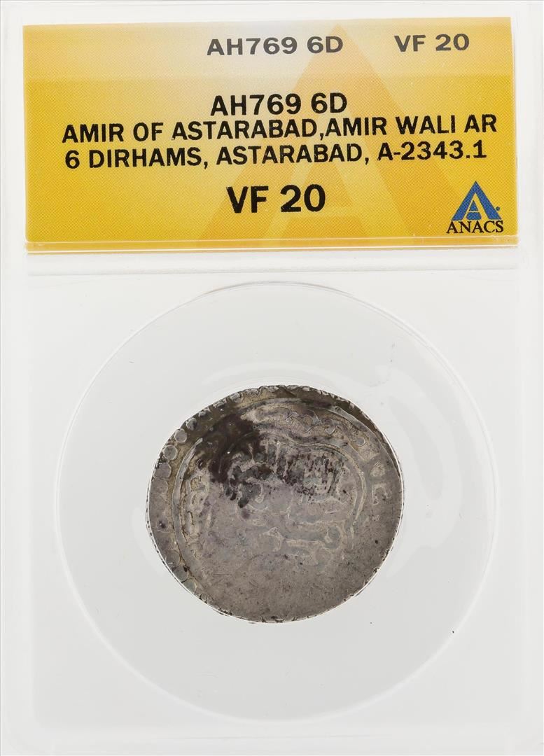 One AH769 6D Amir of Astarabad Amir Wali AR 6 Dirhams Astarabad A2343.1 Coin ANACS VF20. ANACS Certified.