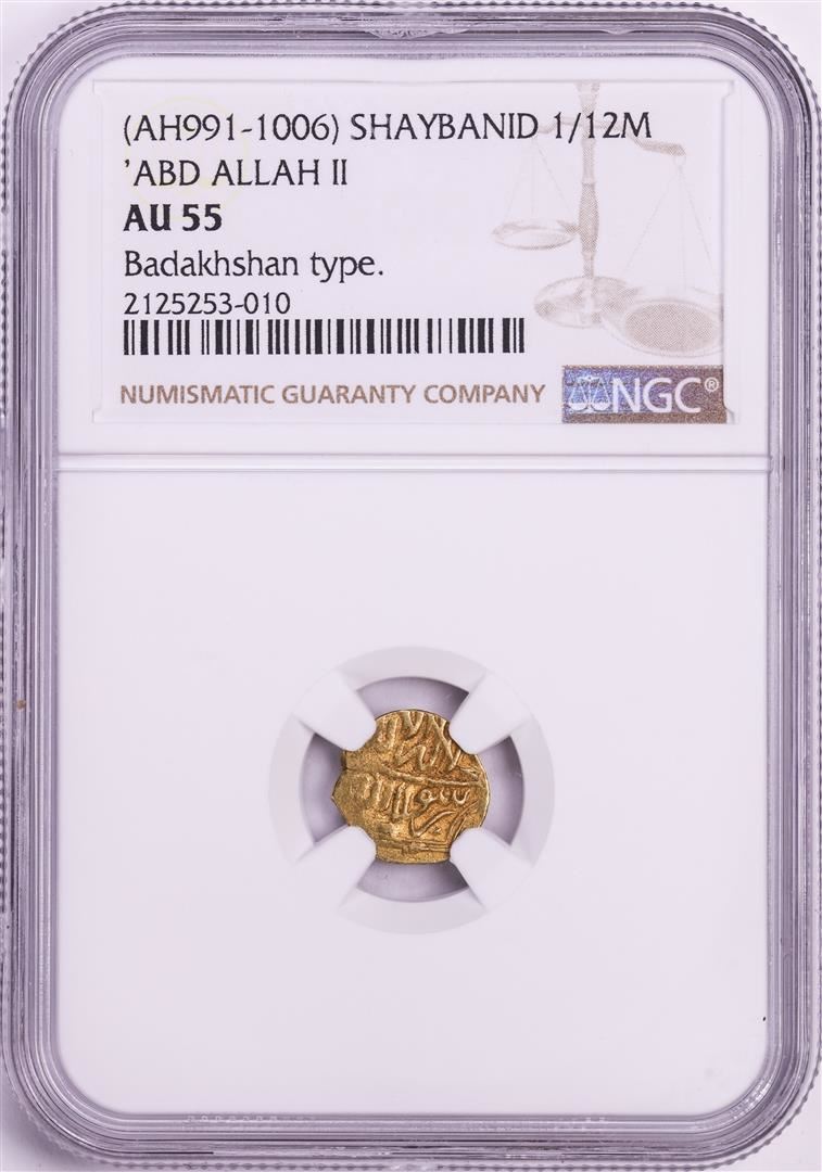 One AH991-1006 Shaybanid 1/12 Mohur 'ABD Allah II' Badakhshan Type Gold Coin NGC AU55. NGC Certified.
