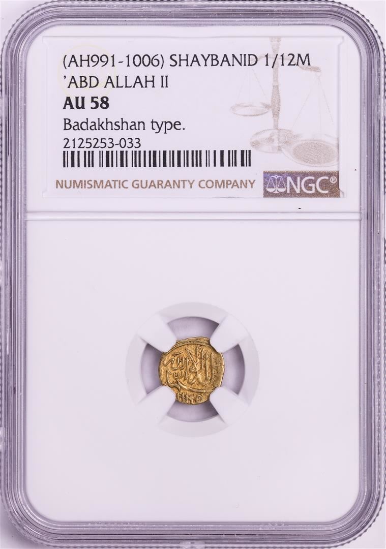 One AH991-1006 Shaybanid 1/12 Mohur 'ABD Allah II' Badakhshan Type Gold Coin NGC AU58. NGC Certified.