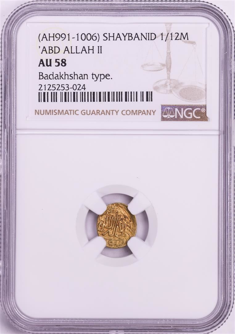 One AH991-1006 Shaybanid 1/12 Mohur 'ABD Allah II' Badakhshan Type Gold Coin NGC AU58. NGC Certified.