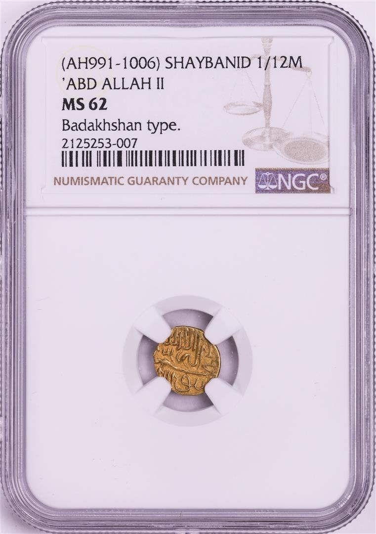 One AH991-1006 Shaybanid 1/12 Mohur 'ABD Allah II' Badakhshan Type Gold Coin NGC MS62. NGC Certified.
