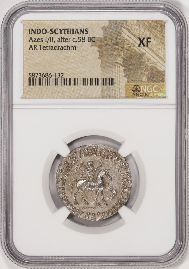 One After c.58 BC Indo-Scythians Azes I/II AR Tetradrachm Ancient Coin NGC XF. NGC Certified.