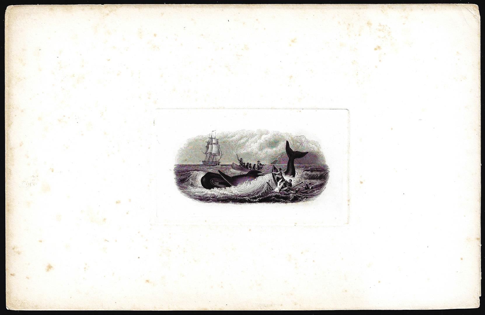 A classic vignette and collector favorite of a whale overturning two boats of harpooners. The engraver of the vignette is unknown; however, it is based on the work of artist James Stewart and is titled "Dying Struggles of the Spermaceti Whale." ABNCo referred to this vignette as "Capsized Boat.