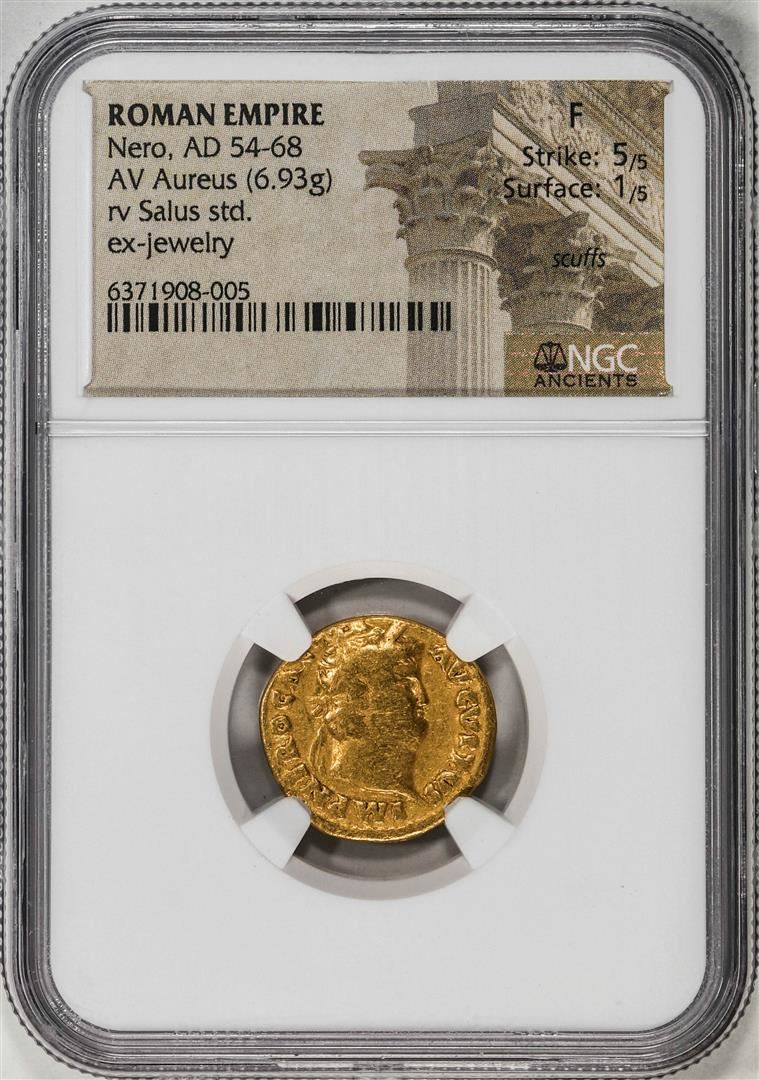 One Ancient Roman Empire Nero 54-68 AD AV Aureus Gold Coin NGC F. NGC Certified.