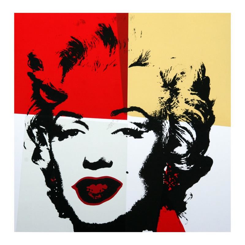 "Golden Marilyn 11.38" is a limited edition silk screen print on museum board from Sunday B Morning featuring the works of Andy Warhol. The piece is stamped in blue on the back with "Published by Sunday B. Morning" and "fill in your own signature" and is accompanied by a certificate of authenticity. Measures approximately 36" x 36".