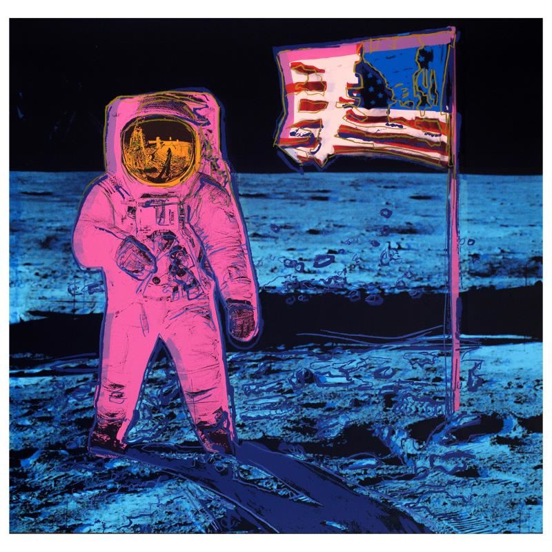 "Moonwalk (Pink)" is a limited edition silk screen print on museum board from Sunday B Morning featuring the works of Andy Warhol. The piece is stamped in blue on the back with "Published by Sunday B. Morning" and "fill in your own signature" and is accompanied by a certificate of authenticity. Measures approximately 38.5" x 38.5".