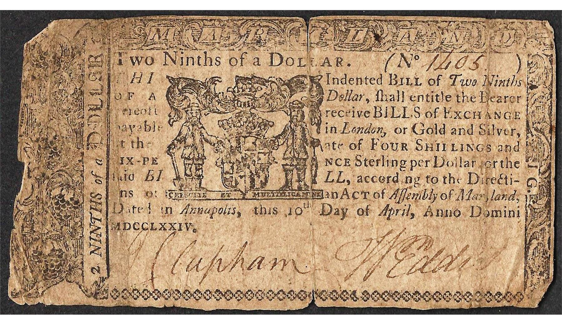 April 10, 1774 $2/9 Maryland Colonial Currency Note