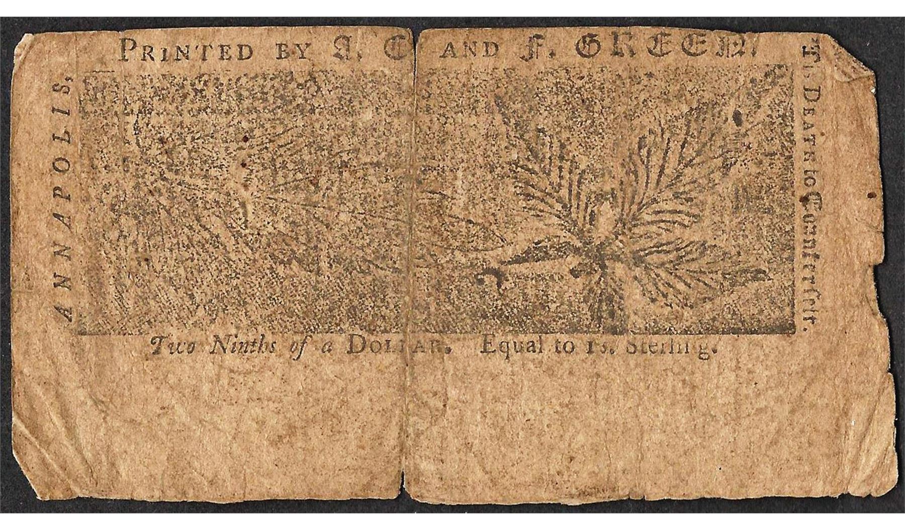 One April 10, 1774 $2/9 Maryland Colonial Currency Note.