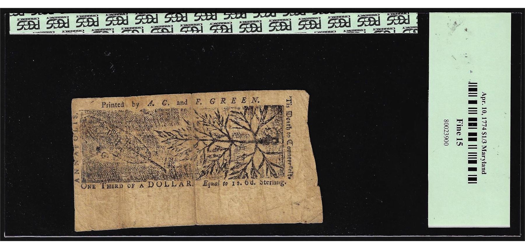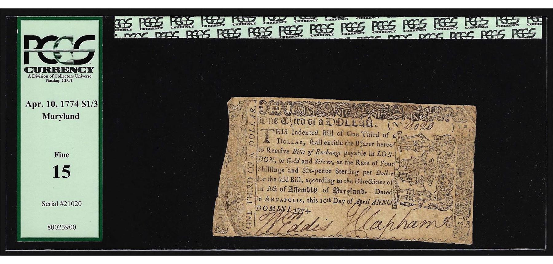 One April 10, 1774 Maryland $1/3 Colonial Currency Note PCGS Fine 15. PCGS Graded.