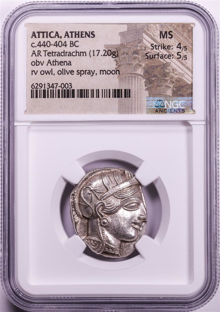 One Attica Athens Greece 440-404 BC Tetradrachm Athena Owl Ancient Coin NGC Choice MS. NGC Certified.