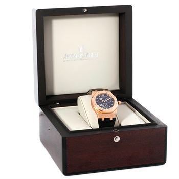 One Audemars Piguet Royal Oak Dual Time 18K Rose Gold Watch. The watch is in excellent condition and the details are as follows: Model: 26120OR.00.D002CR.01, Movement: Automatic self-winding movement. Case: Brushed with polished bevel edges 18K rose gold case 39.0 mm in diameter. Bezel: 18K rose gold bezel punctuated with 8 signature screws. Crystal: Scratch resistant sapphire crystal. Dial: Metallic black dial with and Grande Tapisserie waffle design. Applied rose gold index hour markers and hands with luminescent fill. Dual/Second Time zone sub-dial with an am/pm indicator at the 6 o'clock position. Power Reserve indicator located at the top left side of the dial. Date indicator sub-dial at the top right side of the dial. Bracelet: Black leather strap with 18K rose gold deployment clasp.