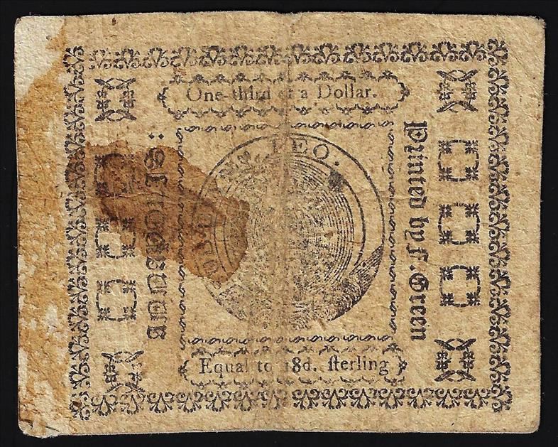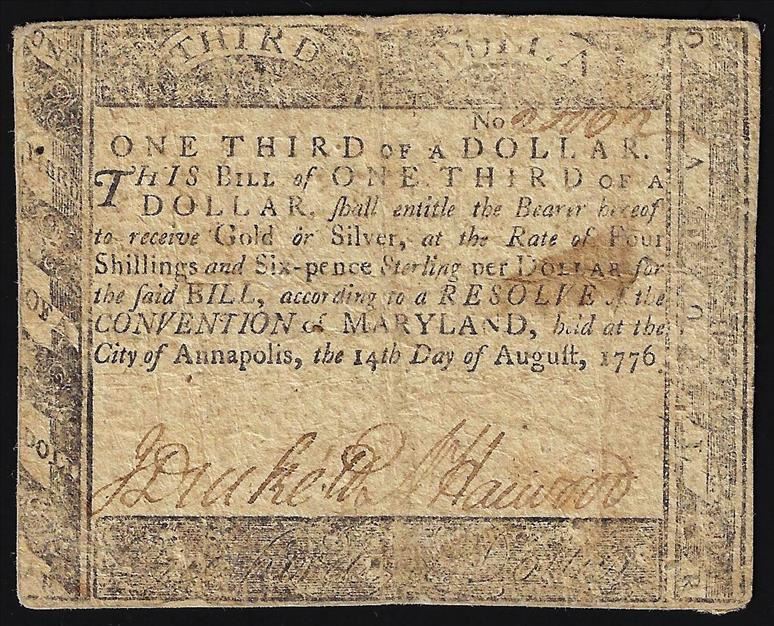 One August 14, 1776 $1/3 Maryland Colonial Currency Note.