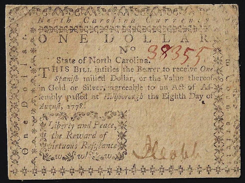 One August 8, 1778 $1 North Carolina Colonial Currency Note.