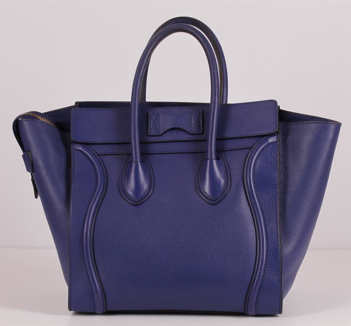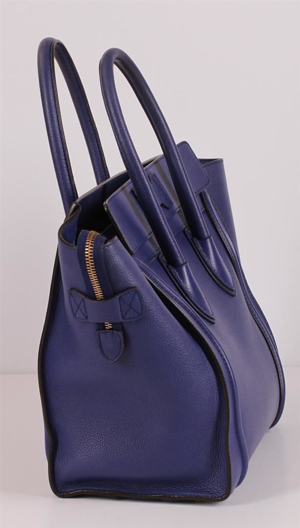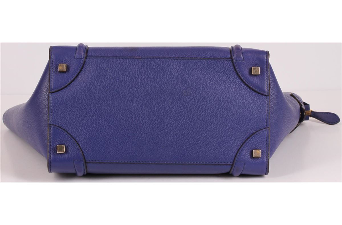 100% Authentic Celine Mini Luggage Bag in Indigo Blue Pebbled Leather. This gorgeous blue handbag is Sold Out and it's easy to see why! Think of this rich deep indigo blue Celine Mini Luggage as a great alternative to a black bag. You can easily match it with just about anything and it goes great with blue jeans. The supple and sturdy pebbled leather means that it is more resistant to scratches and will age beautifully. This sturdy and beautiful bag features rolled leather top handles, scroll-shaped detailing, and expandable sides. The top zipper opens to a matching fabric lining with zippered and patch pockets. This Celine Mini Luggage bag is a wonderful size for either day to day use or as a small overnight bag, a true gem for the chic traveler or fashionista. This pre-loved bag is in great condition with minor signs of wear on leather, some hardware and interior. Please see pictures. Approximate Dimensions: Length 12" x Height 12" x Depth 7" x Drop 4".