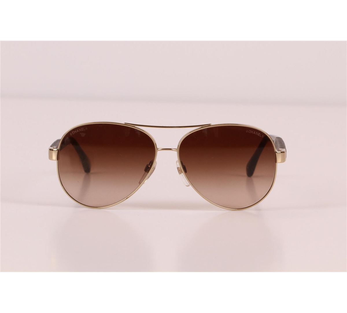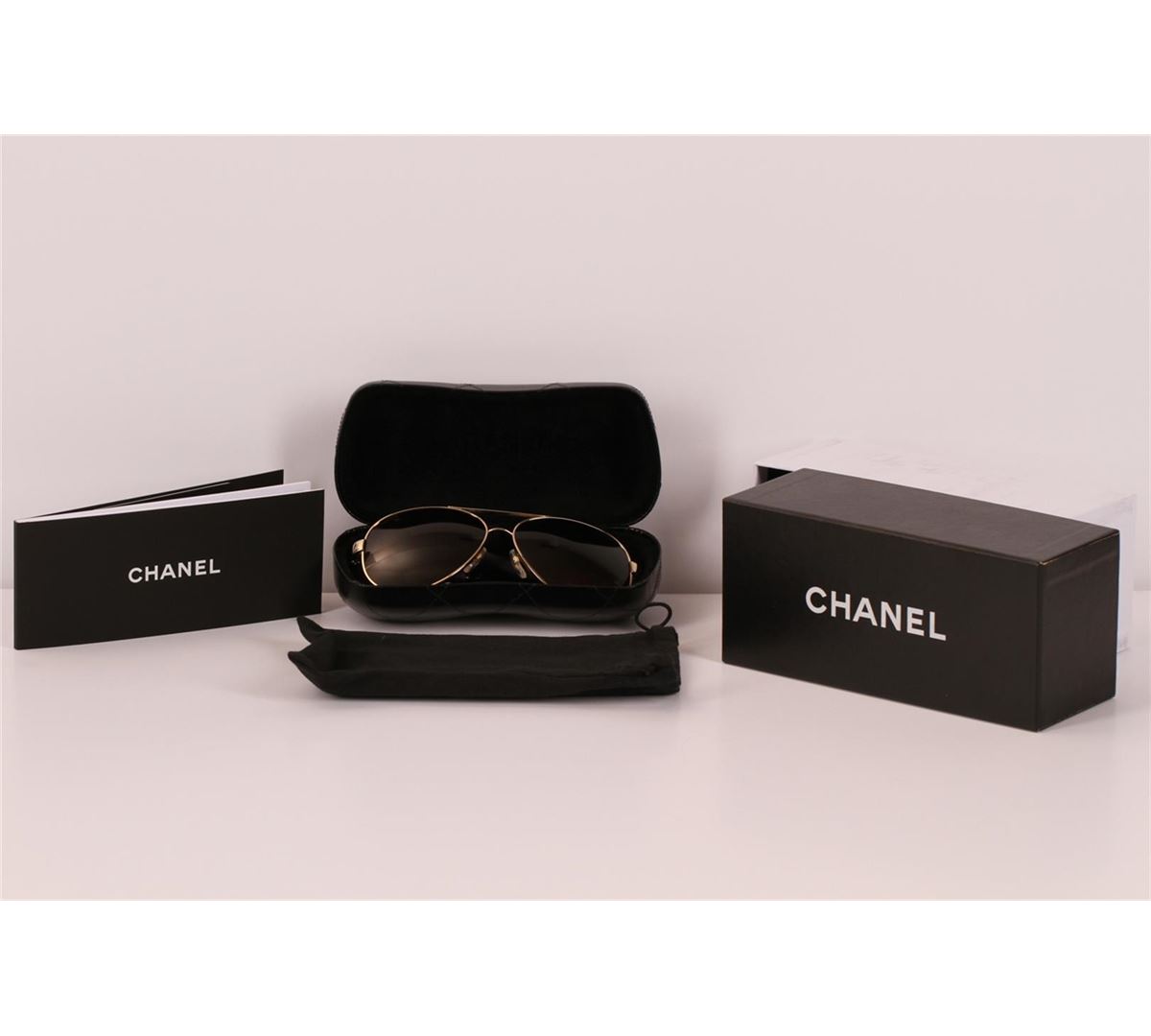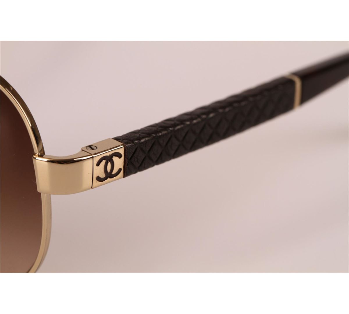 100% Authentic Chanel Gold Aviator Sunglasses. This summer must have features the always in style aviator shape with golden wire frame, brown gradient lenses and quilted design arms with the Chanel interlocking C logo at each hinge. These Chanel glasses come complete with original Chanel box, Chanel sunglasses booklet, black quilted Chanel sunglasses case and soft drawstring Chanel sunglasses pouch. Condition is great with a few very minor small scratches.