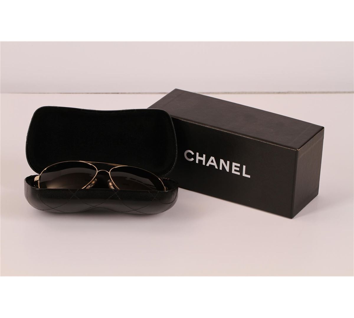 100% Authentic Chanel Gold Aviator Sunglasses. This summer must have features the always in style aviator shape with golden wire frame, brown gradient lenses and quilted design arms with the Chanel interlocking C logo at each hinge. These Chanel glasses come complete with original Chanel box, Chanel sunglasses booklet, black quilted Chanel sunglasses case and soft drawstring Chanel sunglasses pouch. Condition is great with a few very minor small scratches.
