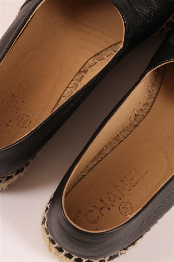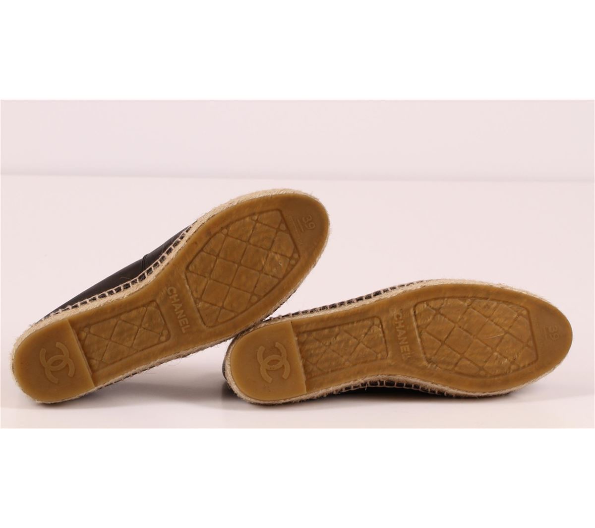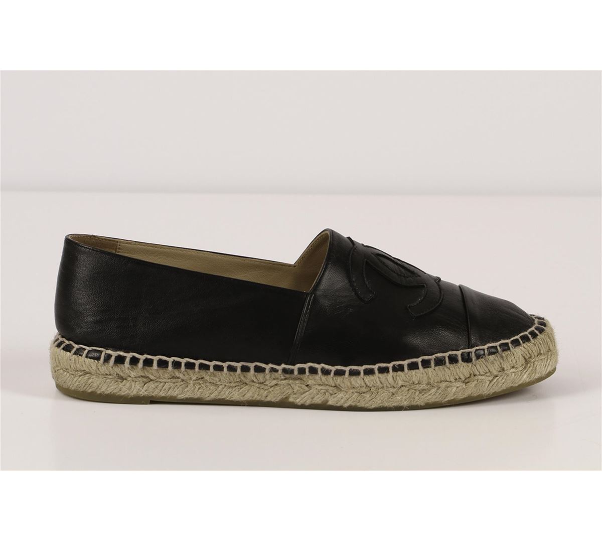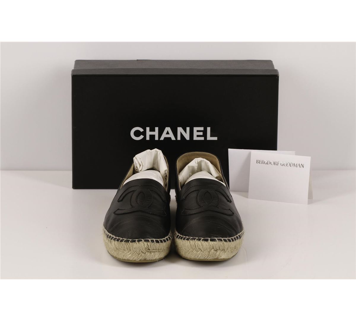100% Authentic Chanel Espadrilles in Black Lambskin Leather. This classic design is made from buttery soft lambskin leather with cap toe and large interlocking C logo on front. Sole trimmed in rope espadrille. These classy and on trend flats will be your go-to shoes for looking chic in comfort. Comes complete with Chanel box, Chanel dust bag, original tissue paper and Bergdorf Goodman notecard. These highly sought after Chanel espadrilles sold out in stores but you can get them here! Guaranteed authentic. European size 39 which fits like a US size 7.5-8.