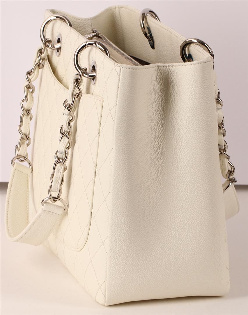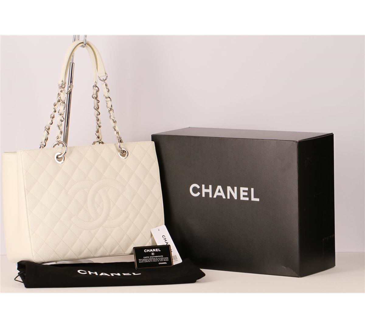 100% Authentic Chanel Grand Shopping Tote in White Caviar Leather with Silver Hardware. This gorgeous Chanel bag comes in great pre-loved condition, complete with original box & original dust bag. The Chanel Grand Shopping Tote or GST is one of the leading "it" bags and for several reasons! It is large enough to pack your daily necessities (and then some), it is stylish enough to make your girlfriends jealous and durable enough to love it forever. The Chanel Grand Shopper Tote has been discontinued in the United States which has only upped its demand and desire within the high-fashion loving community. Don't miss your chance to own this highly sought after bag! The interior is a grey satin textile and boasts several pockets and compartments for organizing. Here you will find an easily accessed leather strap with clasp which you can attach anything you like- keys, coin purse, etc. Approximate Measurements are length 13.5" x width 5" x height 9.75" drop 7.5".