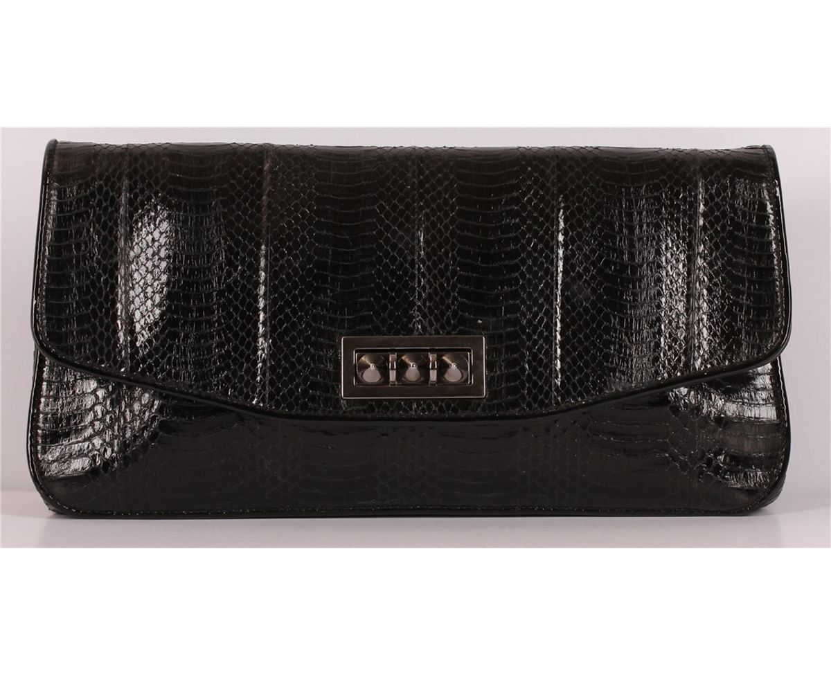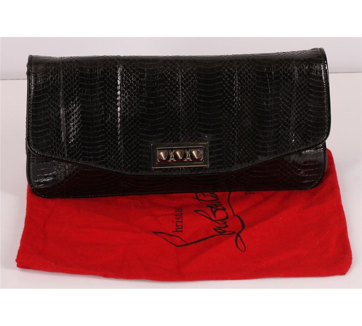 100% authentic Christian Louboutin Black Python Clutch. Luxurious black glazed snakeskin covers the exterior of this stunning evening bag. Three gunmetal spikes pinch together for access and closure of the purse. Features include the Christian Louboutin signature red fabric lined interior with zipped pocket and logo detail at back. Condition is good with some signs of wear on hardware, lining and edges of bag. Please see pictures. This rare Christian Louboutin Python Clutch is the perfect way to add texture and luxury to any outfit.